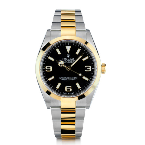 Rolex Explorer 1 in stainless steel and 18kt yellow gold. Integrated stainless steel and 18kt yellow gold oyster band with easy link clasp. Black dial with numbers 3-6-9. Smooth Bezel. Automatic movement. Calibre: 3230. Power reserve: 70 Hours. Water resistance: 100m/330 feet. Scratch resistant crystal. Case size: 36mm. Reference number: 124273. Circa 2025.