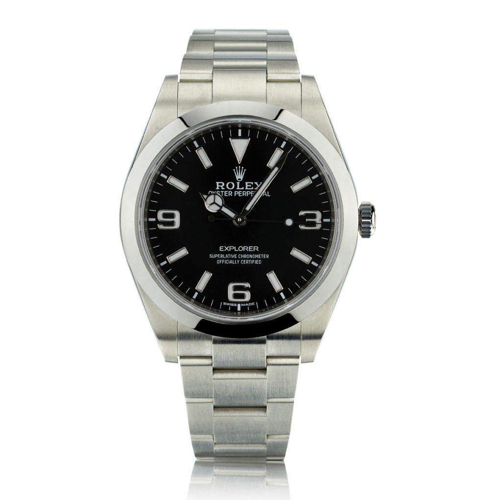 Gent's stainless steel Rolex Oyster Perpetual Explorer wristwatch. Integrated stainless steel Oyster bracelet. Fixed stainless steel domed bezel. Black dial with luminous index markers and arabic numerals. Automatic movement. 39mm case diameter. Sapphire crystal. Long Hand.Year 2017. Reference #: 214270.