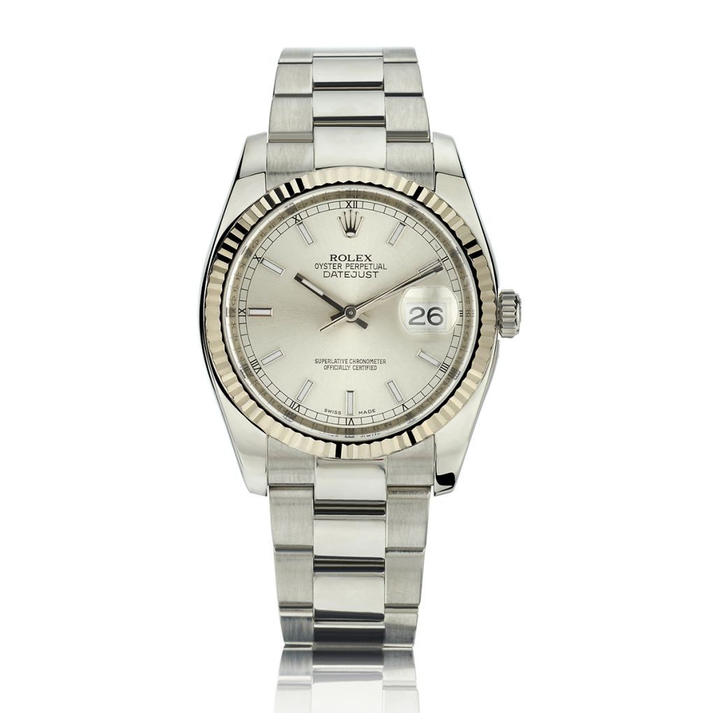 Gent's stainless steel Rolex Oyster Perpetual Datejust wristwatch. Integrated stainless steel Oyster bracelet. 18kt white gold fluted bezel. Silver dial with luminous hands and hour markers; date aperture at the 3 o'clock position. Sapphire crystal. Solid caseback. 36mm case diameter. Automatic movement. Reference #: 116234.