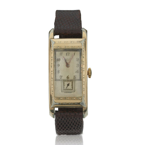 Rolex Prince Observatory "Doctors wristwatch". 10kt gold filled. Beautiful patina original dial with sweep seconds hand. Measuring 36mm x 20mm. Long curved. Manual wind. Jewels:17. Brown leather band with tang closure. Circa 1930's (Art Deco). RARE!!!