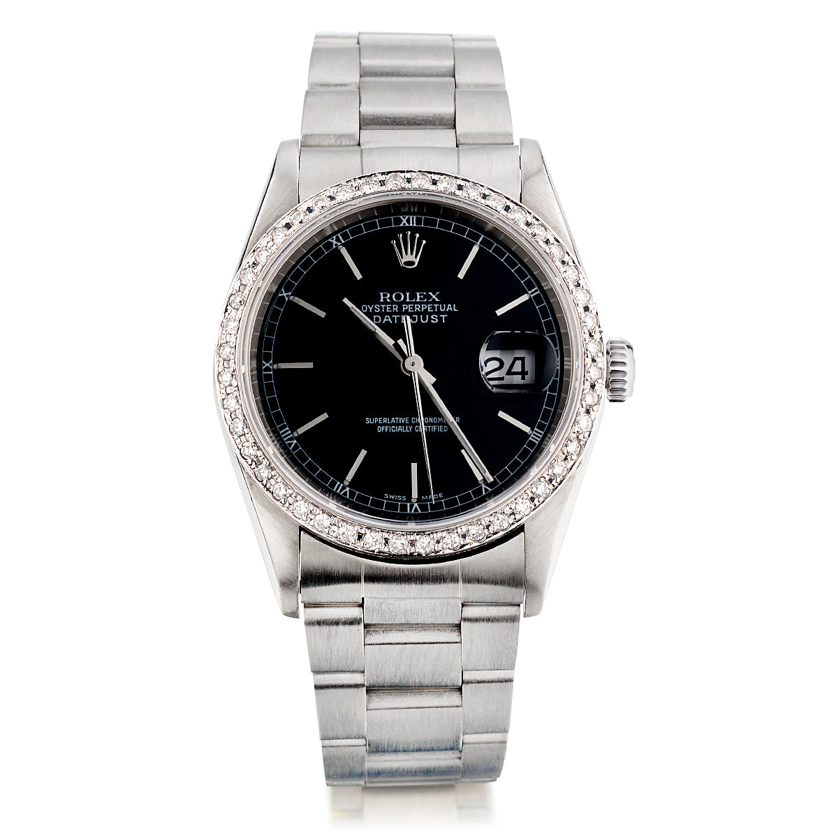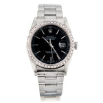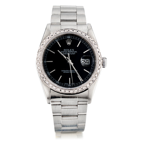Rolex stainless steel Datejust wristwatch. Stainless steel oyster band with fold over clasp. To fit wrist size 8". Black dial with silver stick markers. Custom made diamond bezel. Date. Automatic movement. Sapphire crystal.  Reference number: 16200.