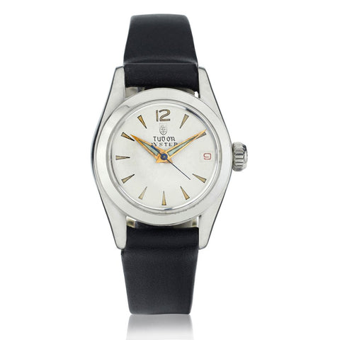 Ladies Rolex Tudor stainless steel wristwatch. Oyster. 25 mm case size. Red Font date which is a rarity in Rolex. Ivory dial. Luminous hands. Manual winding. Sapphire crystal. Circa 1954. All original. New aftermarket black leather band.
