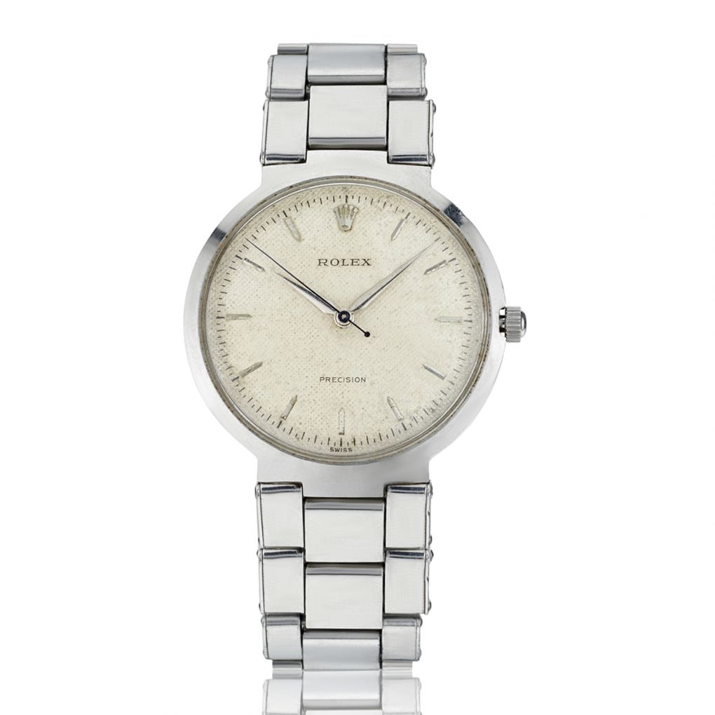 Rolex "UFO Flying Saucer" in stainless steel. Integrated original stainless steel oyster bracelet with original flip lock buckle.7 mm wrist size. 31mm case diameter. 2 piece stainless steel case. Honeycomb textured dial with raised markers and sweep seconds hand. Manual winding precision movement.Calibre:1210.Jewels:17.Circa 1958.May be worn by a man or woman.