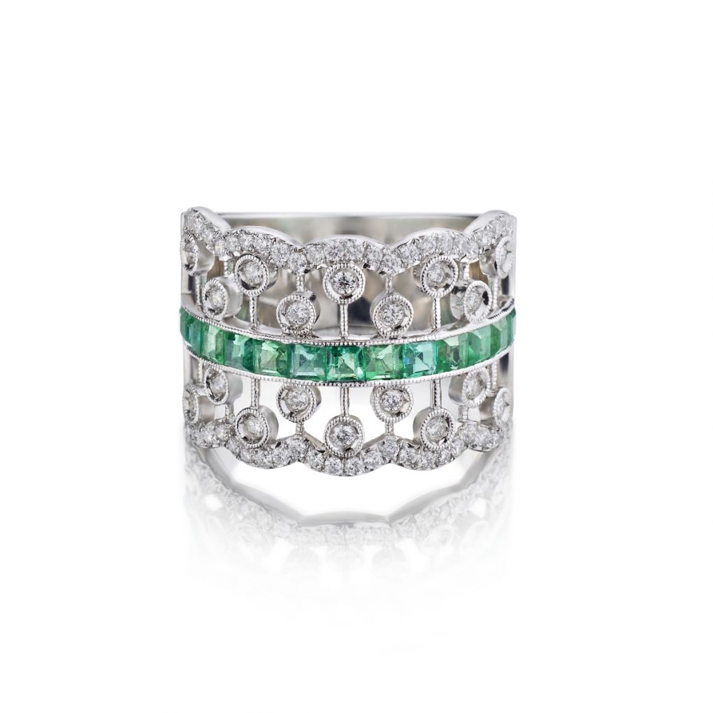 Ladies beautiful 14kt white gold green emerald and diamond wide band featuring 0.51 carat total weight of Round Brilliant cut diamonds of (VS-SI) in clarity and (G-H) in color. Also features 1.16 carat total weight of square-cut green emeralds. Finger size 7 currently but can be resized. Signed 'BKC'.