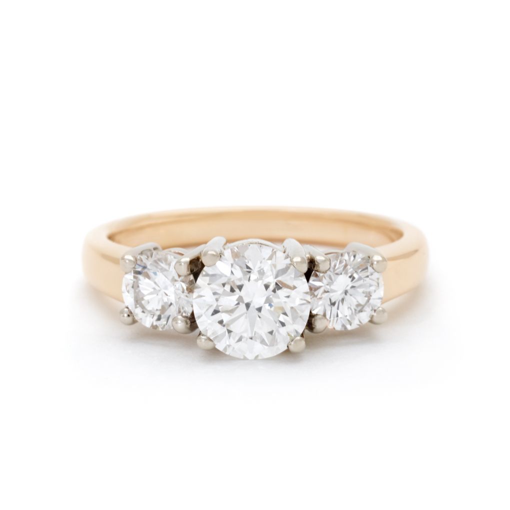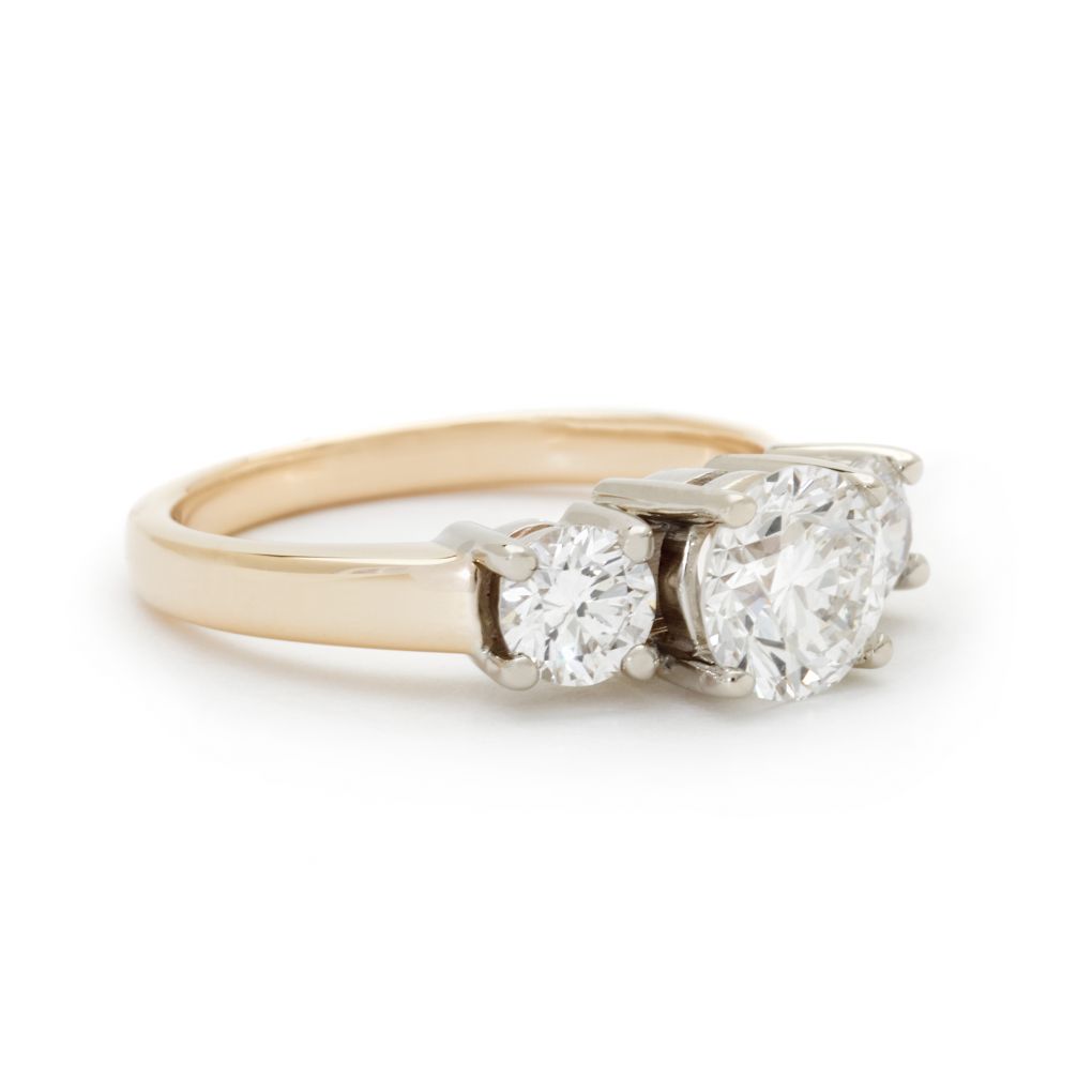 Ladies 14kt Yellow Gold claw-set diamond ring featuring a Round Brilliant cut diamond in the centre weighing 1.04 carat weight of (VS-1) in clarity and (F) in color. Also containing 0.66 total carat weight of round brilliant cut diamonds on either side of (VS) in clarity and (F-G) in color.