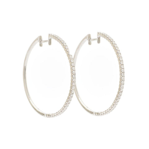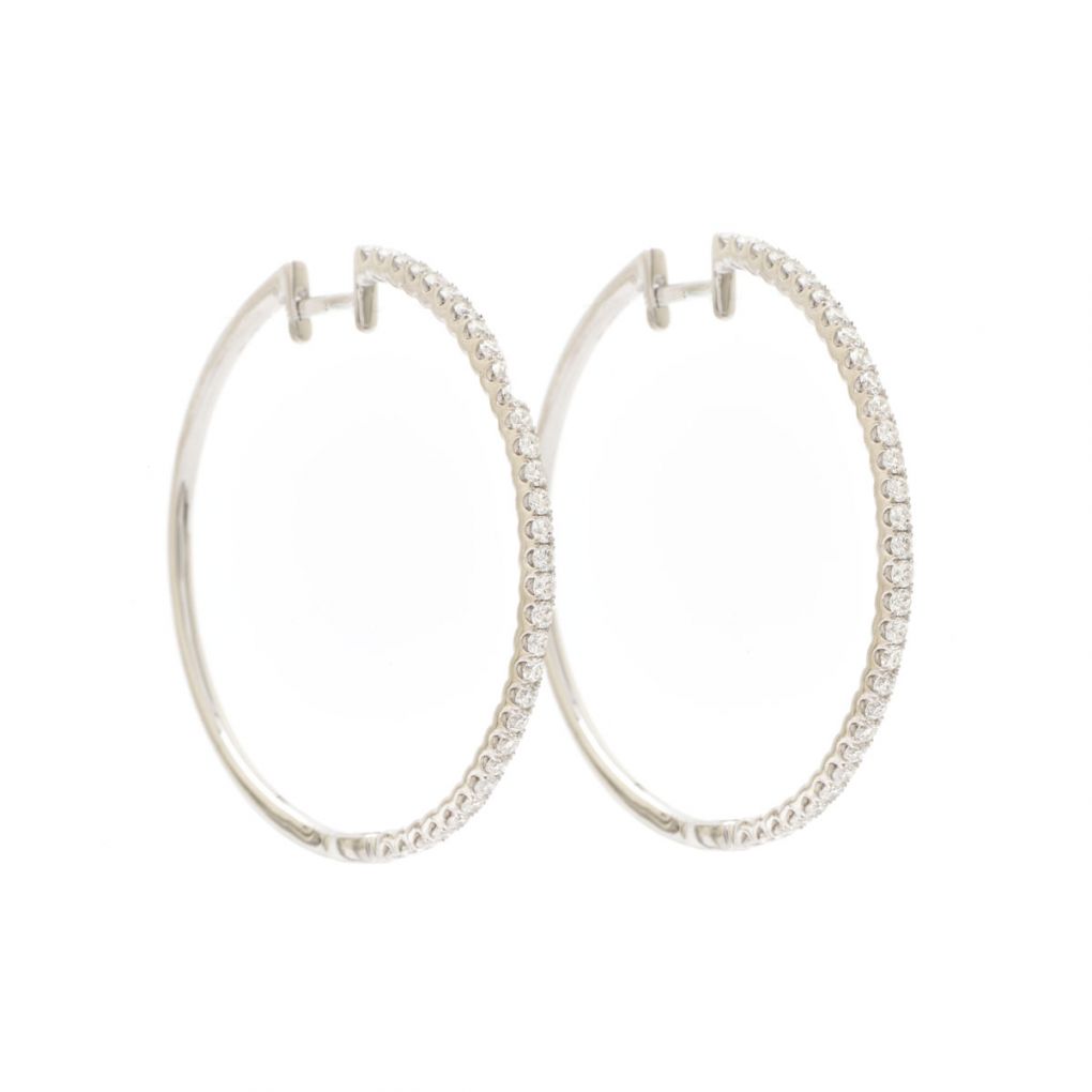Ladies 14KT white gold round-shaped super-fine diamond hoop earrings featuring a single row of Round Brilliant cut diamonds weighing approximately 1.00 carat total weight. Approximately 1.5″ in diameter.