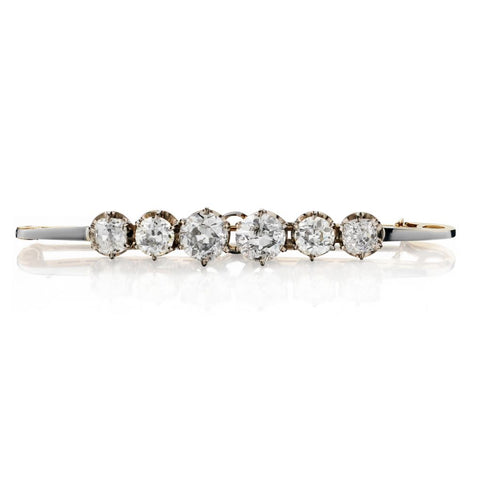 Beautiful Vintage Platinum diamond "Baby Pin" brooch featuring 2 x Mine cut diamonds weighing 1.60 total carat weight and 2 x European cut diamonds weighing 2.90 total carat weight and 2 x European cut diamonds weighing 1.60 total carat weight .(SI-2-I-1) in clarity and (I-J) in colour .Approximately 6.00 total carat weight . Length :66mm.