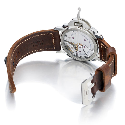 Panerai Marina Militare Luminor in steel. Calf leather band with Panerai steel tang. Limited Edition. #324 / 1,000.00. Black dial with Arabic numerals. Skeleton back. Sapphire crystal. Case size: 47 mm. Manual winding. Jewels: 21. Power reserve: 72 hours. Water resistance: 10 ATM. Pam: 324. Purchased 2017
