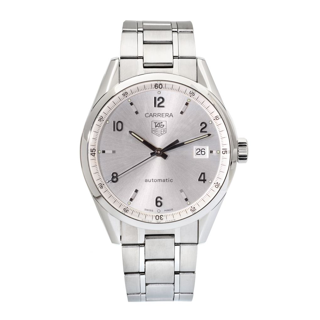 Gent's stainless steel Tag Heuer Carrera Calibre 5 Automatic wristwatch. Integrated stainless steel bracelet. Silver dial; date aperture at the 3 o'clock position. 39mm case diameter. Transparent case-back. Automatic movement. Sapphire crystal. Reference #:WV211A.