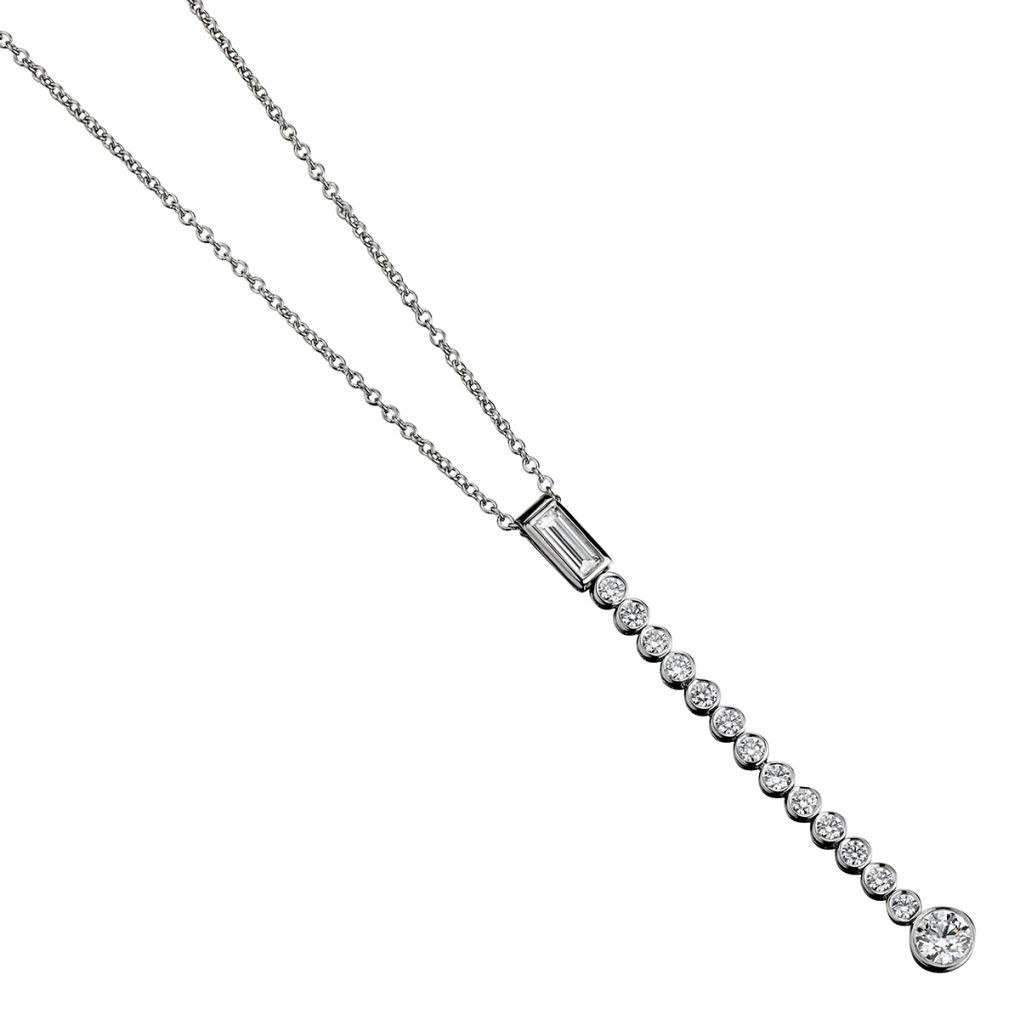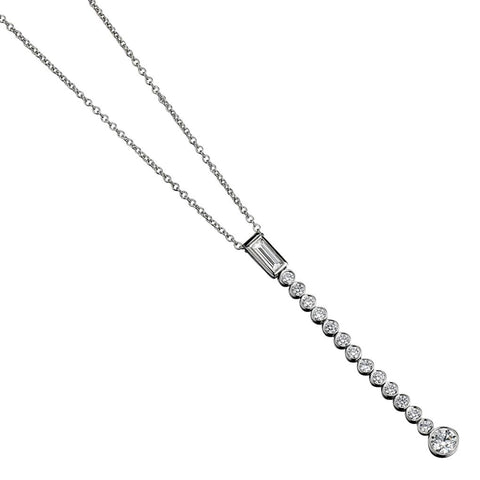 Ladies elegant and timeless Tiffany & Co "Jazz Collection"set in platinum pendant featuring fourteen Brilliant cut diamonds weighing approximately 0.42 total carat weight of Brilliant cut diamonds, bezel set.One diamond baguette cut diamond weighing approximately 0.14 carat weight . (VS-1 -VS-2) in clarity and (G) in colour.Chain length is 16 inches.