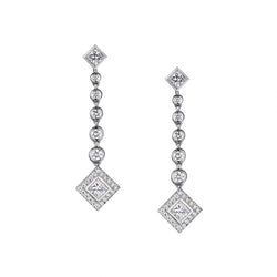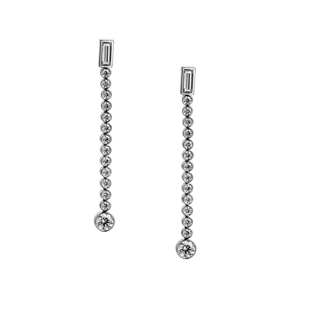 Tiffany & Co diamond pendant earrings."Jazz Collection" Long Drop . Set in Platinum. These earrings are set with 28 x 0.84 total carat weight of Brilliant cut diamonds of (VS-1-VS-2) in clarity and (G) in color. Also containing 2 x 0.26 total carat weight of Baguette cut diamonds of (VS-1-VS-2) in clarity and (G) in color.