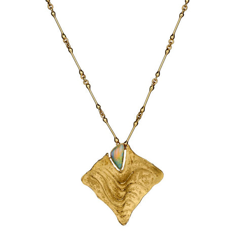 Ladies 18kt custom design pendant/brooch pendant on a custom link 18kt yellow gold chain. Created by Peter Cullman (South Africa). This pendant is designed in the form of a Manta Ray fish. This pendant measures 45mm (L) X 47mm(W). It is set with a large multi colored opal. 18"(L) custom made bar link chain. Weight:36.89 grams. Can be worn as pendant or brooch.