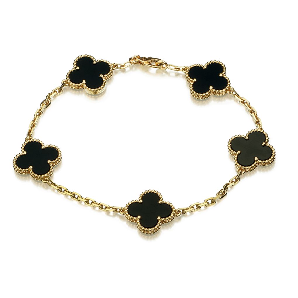 • Van Cleef & Arpels 5 Motif Yellow Gold Onyx Vintage Alhambra Bracelet