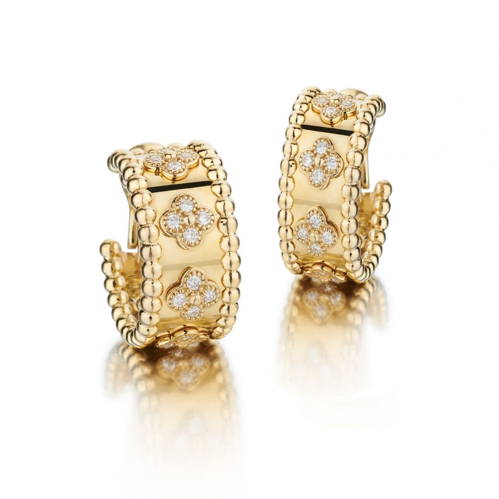 • Van Cleef & Arpels Yellow Gold Perlee Clover Diamond Hoop Earrings