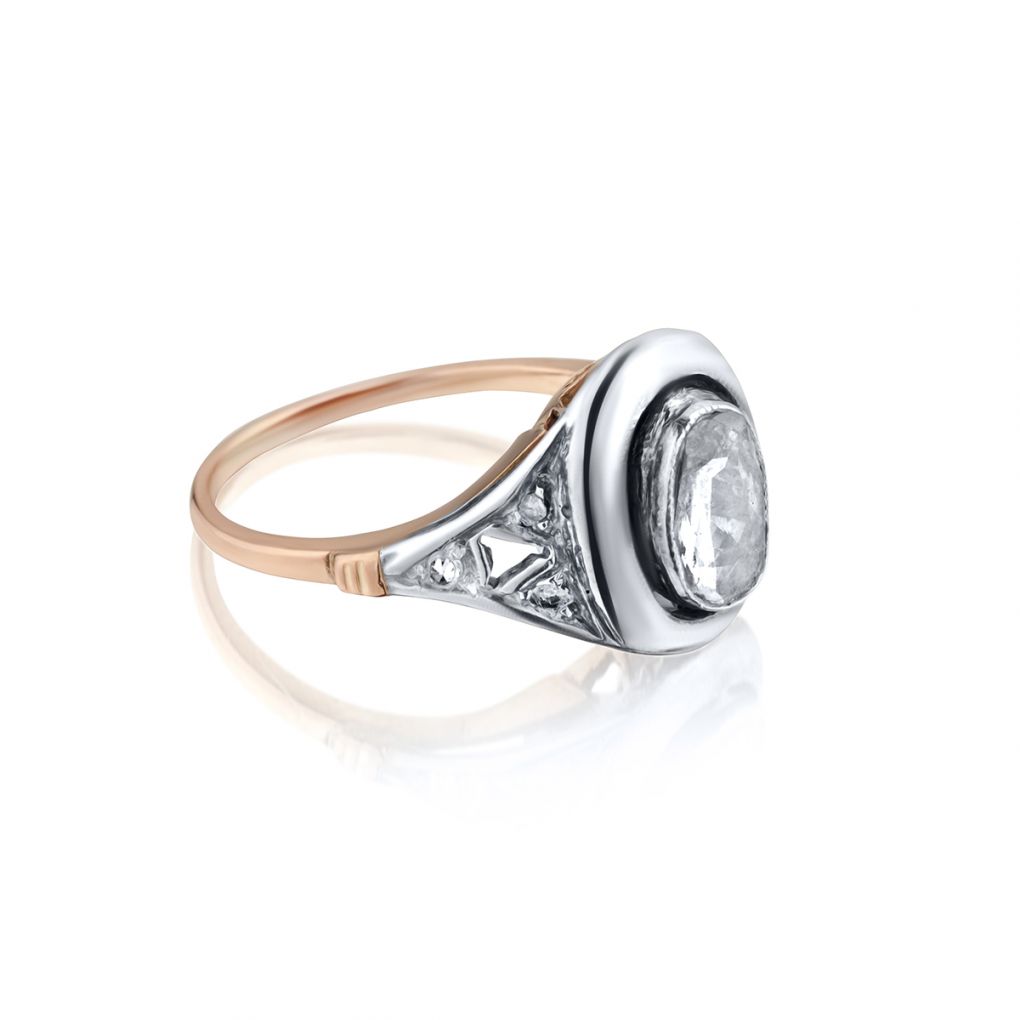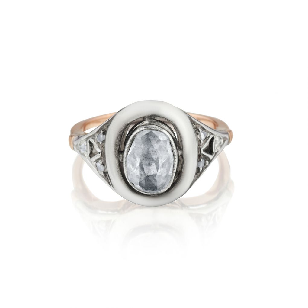 • Victorian Diamond Ring set with an Oval Rose Cut Diamond. Silver & 14kt Rose Gold