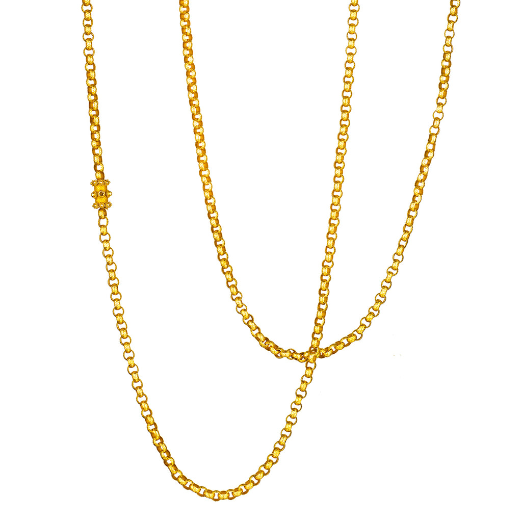 Vintage 18kt yellow gold chain. Interlocking rings with textured finish. Unique clasp closure. Measuring:42" (L). Weight: 33 grams.