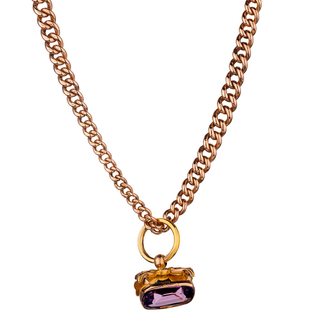 Vintage Victorian 9kt rose gold Albert link chain. Featuring an oval Amethyst stone in a bezel setting. Each link has been individually stamped with a 9kt gold hallmark. Chain measures: 17"(L).Total weight: 64 grams.