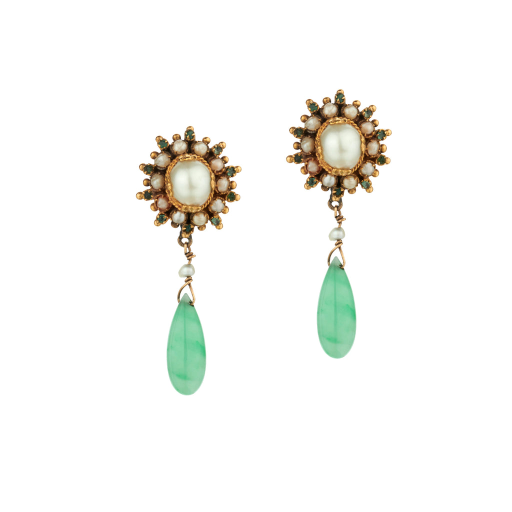 Vintage 18kt Gold Jade and Seed Pearl pendant / drop earrings. Untreated green Emeralds. 41mm (L). Post and butterfly closure. Not readily replaceable.