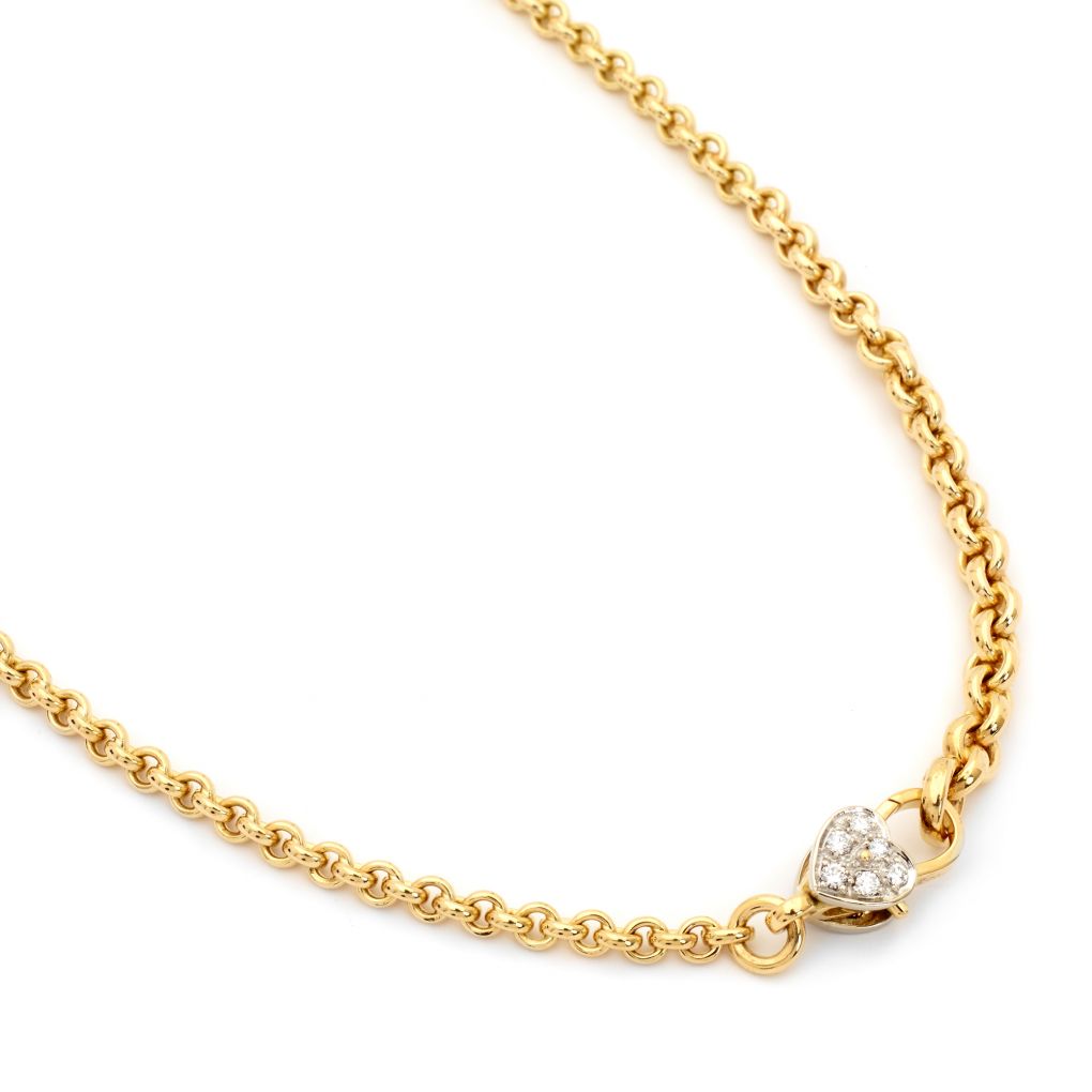 Ladies 18kt yellow gold Pomellato chain necklace featuring a white gold pavé-set diamond heart lobster clasp.