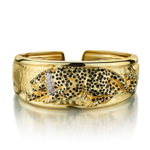 Yellow Gold Panther Diamond, Emerald And Black Enamel Cuff Bangle