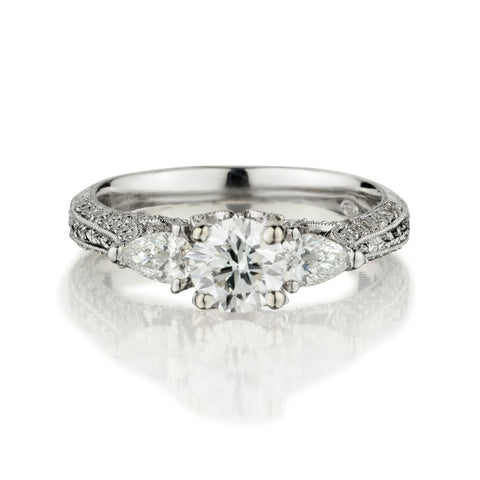 Ladies 18kt white gold diamond engagement ring featuring a 0.72 carat Round Brilliant cut diamonds of (VS-1) in clarity and (F) in color; flanked between (2) Pear-shaped diamonds weighing 0.34 carat total weight of (VS2) in clarity and (F-G) in color. Further enhanced by 82 bead-set round brilliant cut diamonds of (VS2) in clarity and (F-G) in color and filigree going 3/4 way around. Currently a finger size 7 but can be resized.