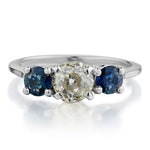Ladies platinum vintage three stone engagement ring featuring a 0.80 carat Cushion-cut diamond of (VS) in clarity and (Fancy yellow) in color. Flanked by 2 x 0.60 carat total weight of blue sapphires. Currently a finger size 5 1/4 but can be resized.