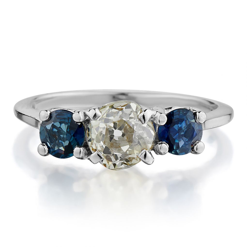 • 0.80 Carat Old-Mine Cut Fancy Yellow Diamond And Sapphire Vintage Ring