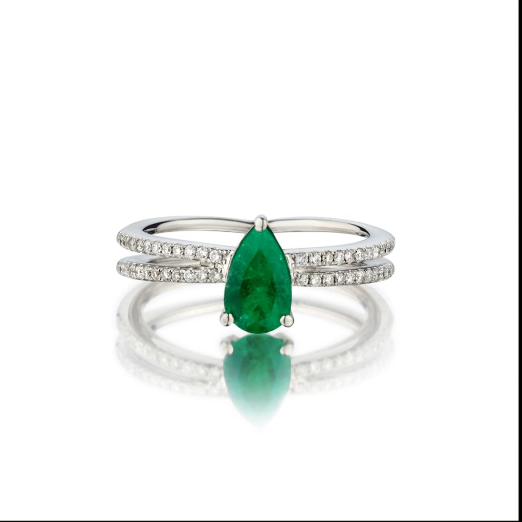 Ladies 18kt white gold emerald and diamond ring featuring a 0.85 carat pear-shaped Green emerald of deep green color; further accented with 0.25 carat total weight of Round Brilliant cut diamonds on a split shank. Currently a finger size 6 but can be resized.