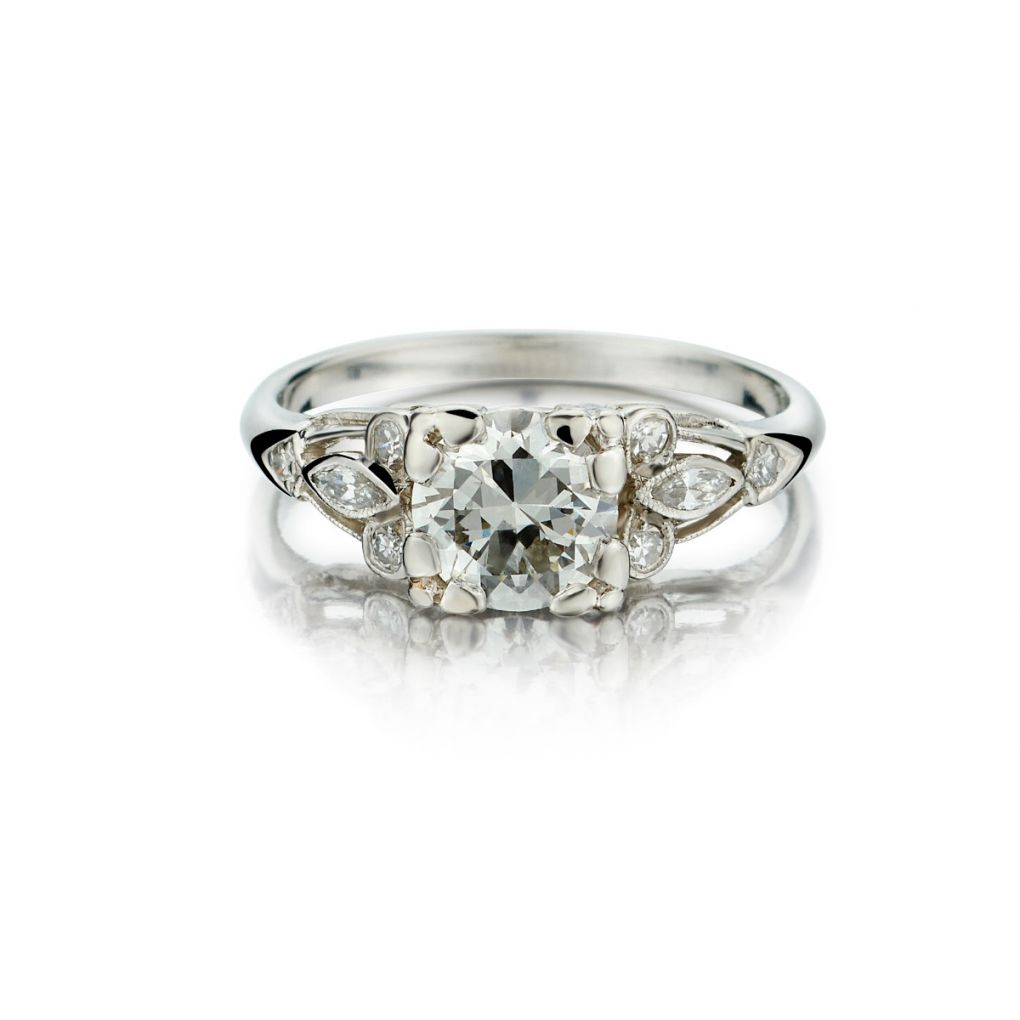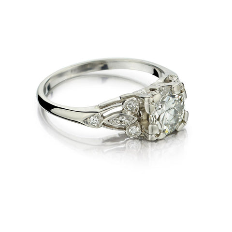 Ladies platinum diamond Art-deco engagement ring featuring a 0.85 carat Old-European cut diamond of (VS) in clarity and (F-G) in color. Further enhanced by 0.20 carat total weight of single cut and marquise cut diamonds. Currently a finger size 4 1/2 but can be resized. Circa 1930's.