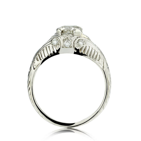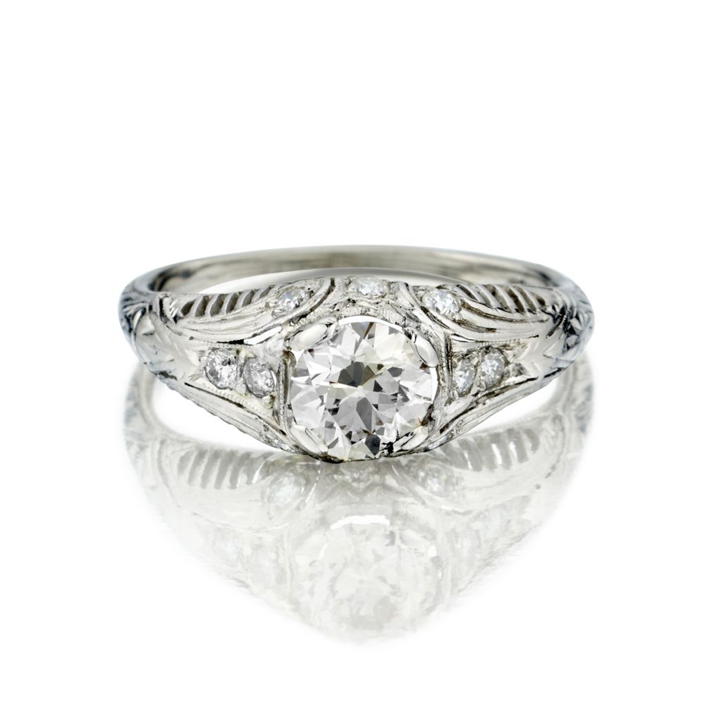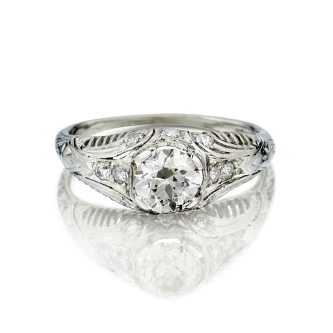 Ladies platinum Edwardian era engagement ring featuring a 0.90 carat Old-European cut diamond of (VS-2) in clarity and (K) in color; further enhanced by 10 Old-Mine cut diamonds weighing 0.20 carat total weight. Currently a finger size 7 1/2 but can be resized. Circa 1910. Beautiful filigree work design.