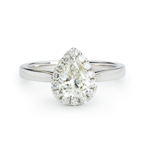 Ladies beautiful 18kt white gold halo-set diamond ring featuring a 0.90 carat Pear-Shaped diamond of (I-1) in clarity and (H) in color. The centre-stone is surrounded by a halo of Round Brilliant cut diamonds weighing approximately 0.25 carat total weight.