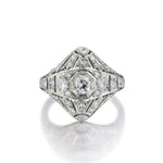Ladies platinum and diamond vintage engagement ring featuring 1.00 carat total weight of Old-European cut and Single cut diamonds. Currently a finger size 5 1/2 but can be resized. 12mm (l) x 20mm (w).
