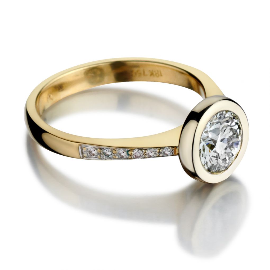 Ladies 18kt yellow and white gold custom made ring featuring a 1.02 carat Round Brilliant cut bezel-set diamond of (VS) in clarity and (I-J) in color. 12 x 0.10 carat total weight of Round Brilliant cut diamonds along the shank. Currently a size 6 1/2 but can be resized.