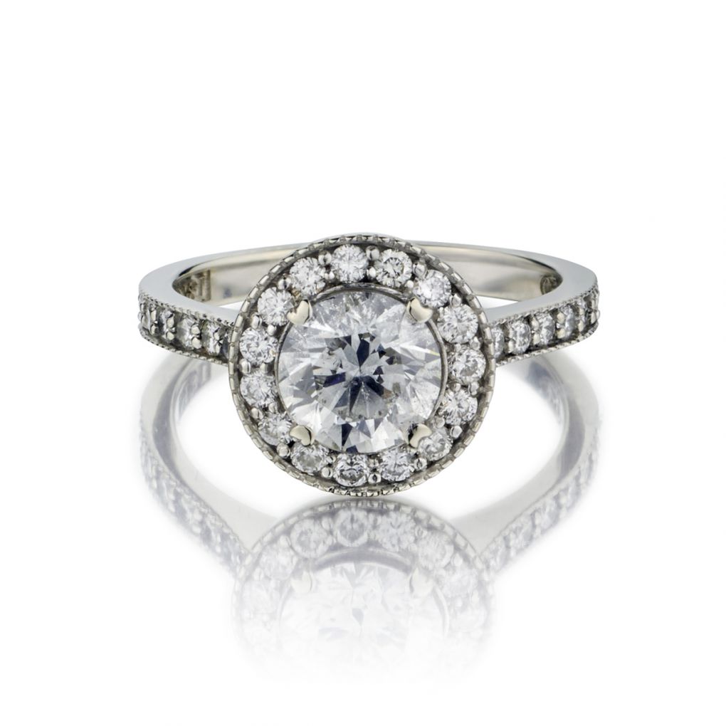 • 1.03 Carat Round Brilliant Cut Diamond Halo-Set Engagement Ring
