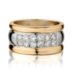 Ladies 14kt yellow and white gold diamond band featuring 12 x 1.07 carat total weight Round Brilliant cut diamonds of (SI) in clarity and (H-I) in color. 10mm (w). Size 6 3/4 but can be resized.