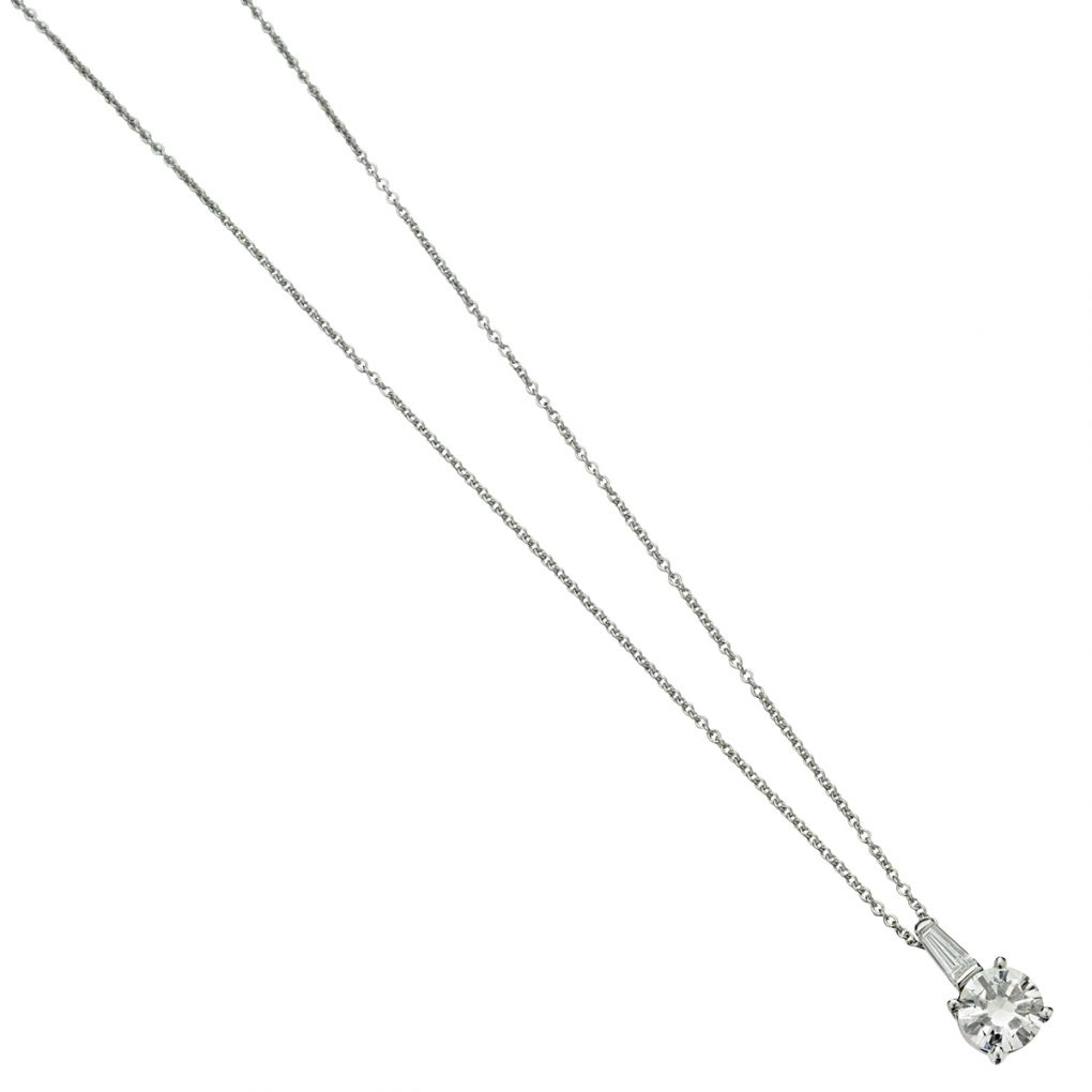 Ladies beautiful n18kt white gold and diamond pendant featuring a 1.10 carat Round Brilliant cut diamond of (VS-2) in clarity and (H) in color. Diamond attached to a tapered baguette. Featured on a Tiffany & Co. platinum fine chain that is 18" in length.