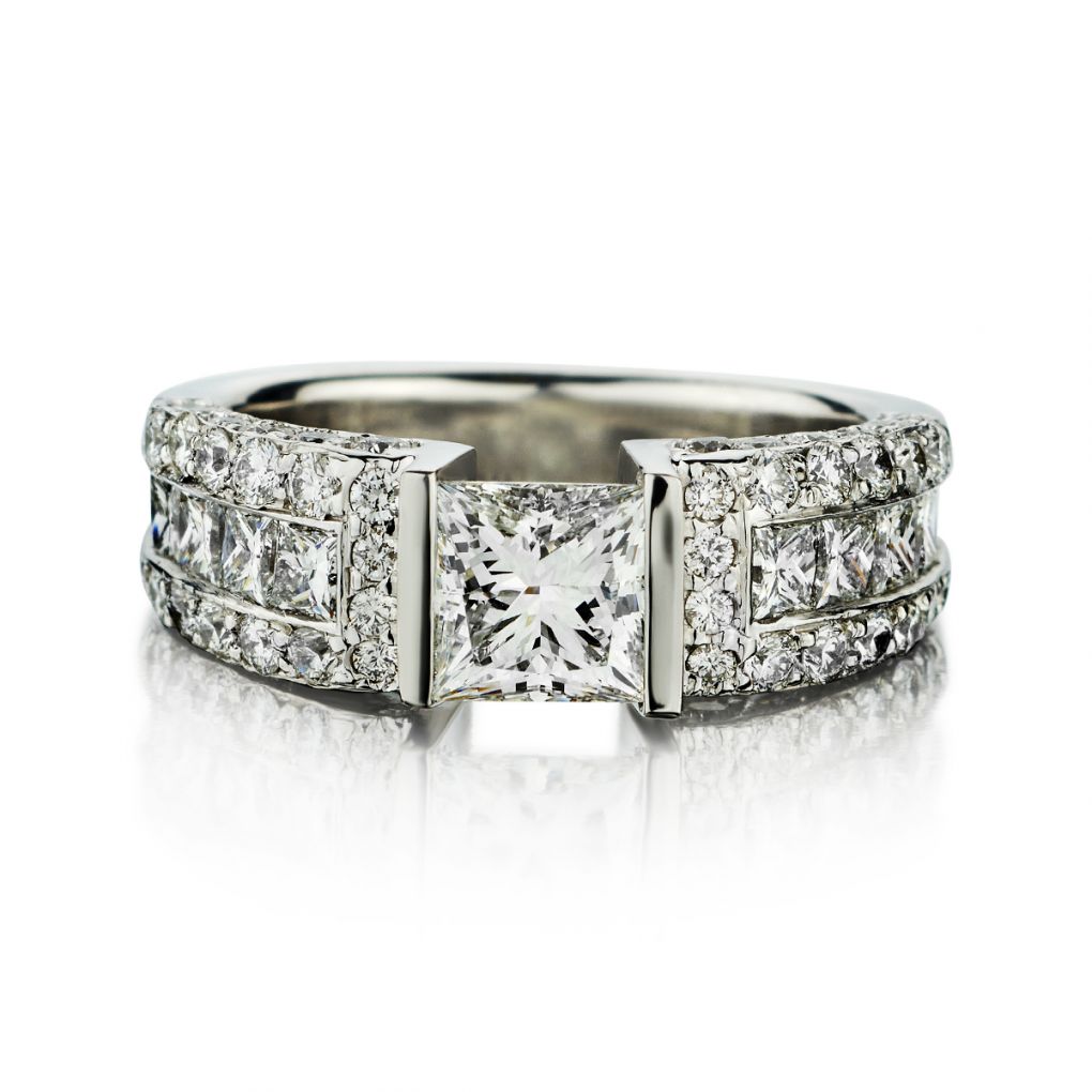 Ladies 14kt white gold diamond engagement ring featuring a 1.20 carat Princess cut diamond of (VVS) in clarity and (H) in color. Further enhanced by 1.30 carat total weight of Round Brilliant cut and Princess cut diamonds of (VS) in clarity and (G) in color. Currently a finger size 6 3/4 but can be resized.