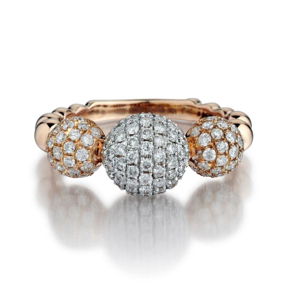 Ladies 18kt rose and white gold pave-set ball ring featuring 1.21 carat total weight of Round Brilliant cut diamonds of (VS-SI) in clarity and (G) in color. 7 1/4" in size but can be resized.