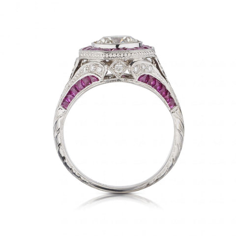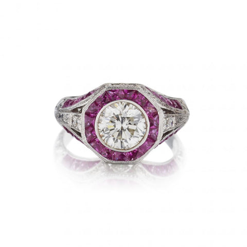 Ladies 18kt white gold vintage-inspired ruby and diamond ring featuring a 1.25 carat Round Brilliant cut diamond of (VVS) in clarity and (H) in color; surrounded by 1.00 carat total weight of French cut rubies. Further enhanced by 0.22 carat total weight of Round Brilliant cut diamonds of (VS) in clarity and (G) in color.