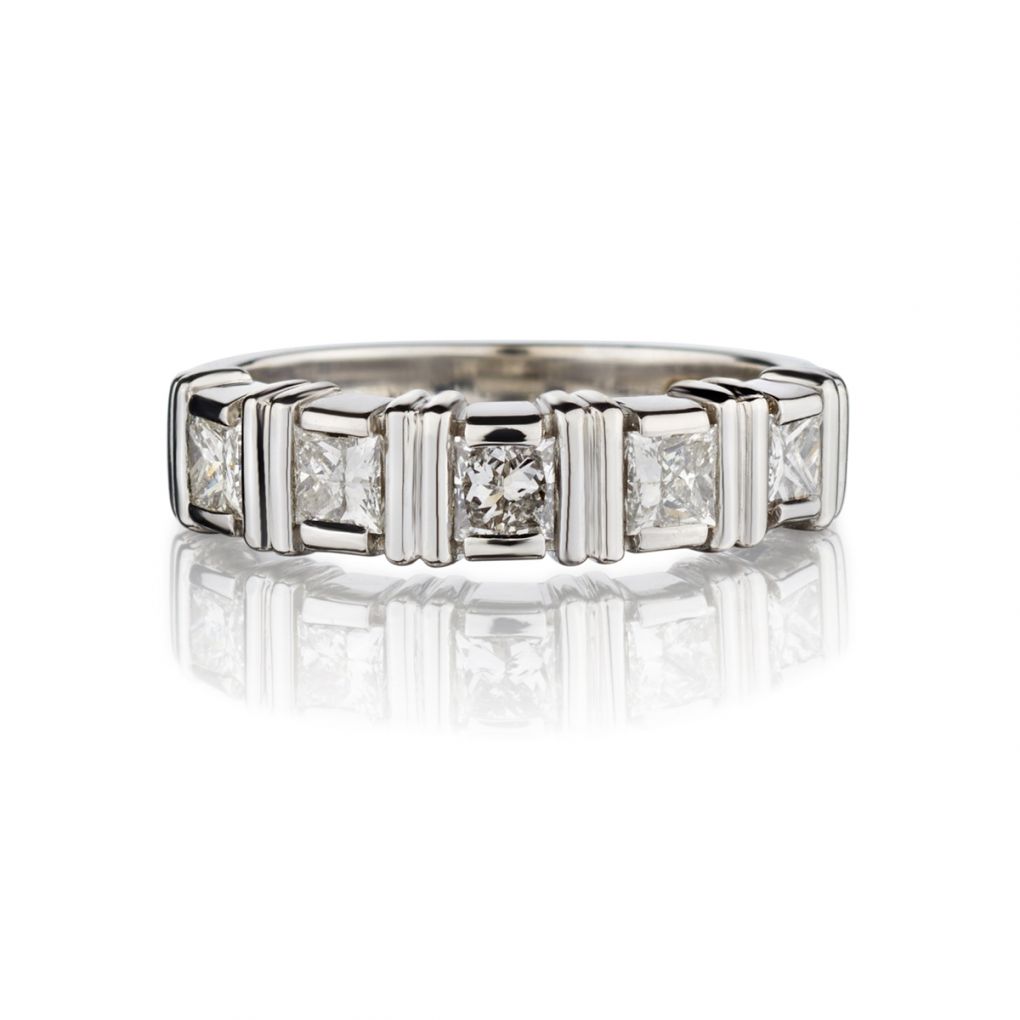 Ladies 14kt white gold diamond band enhanced by (5) Princess cut diamonds weighing 1.50 carat total weight of (VS) in clarity and (H-I) in color; with two white gold bars in between. Currently a finger size 6 3/4 but can be resized.