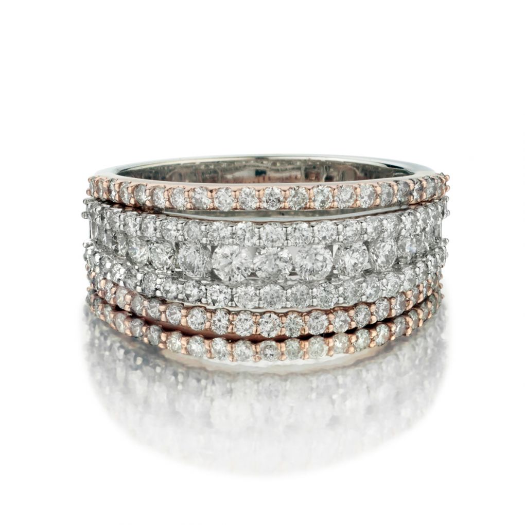 Ladies 14kt white and rose gold diamond band featuring 1.50 carat total weight of Round Brilliant cut diamonds of (I-1) in clarity and (H-I) in color. Currently a finger size 7 but can be resized.
