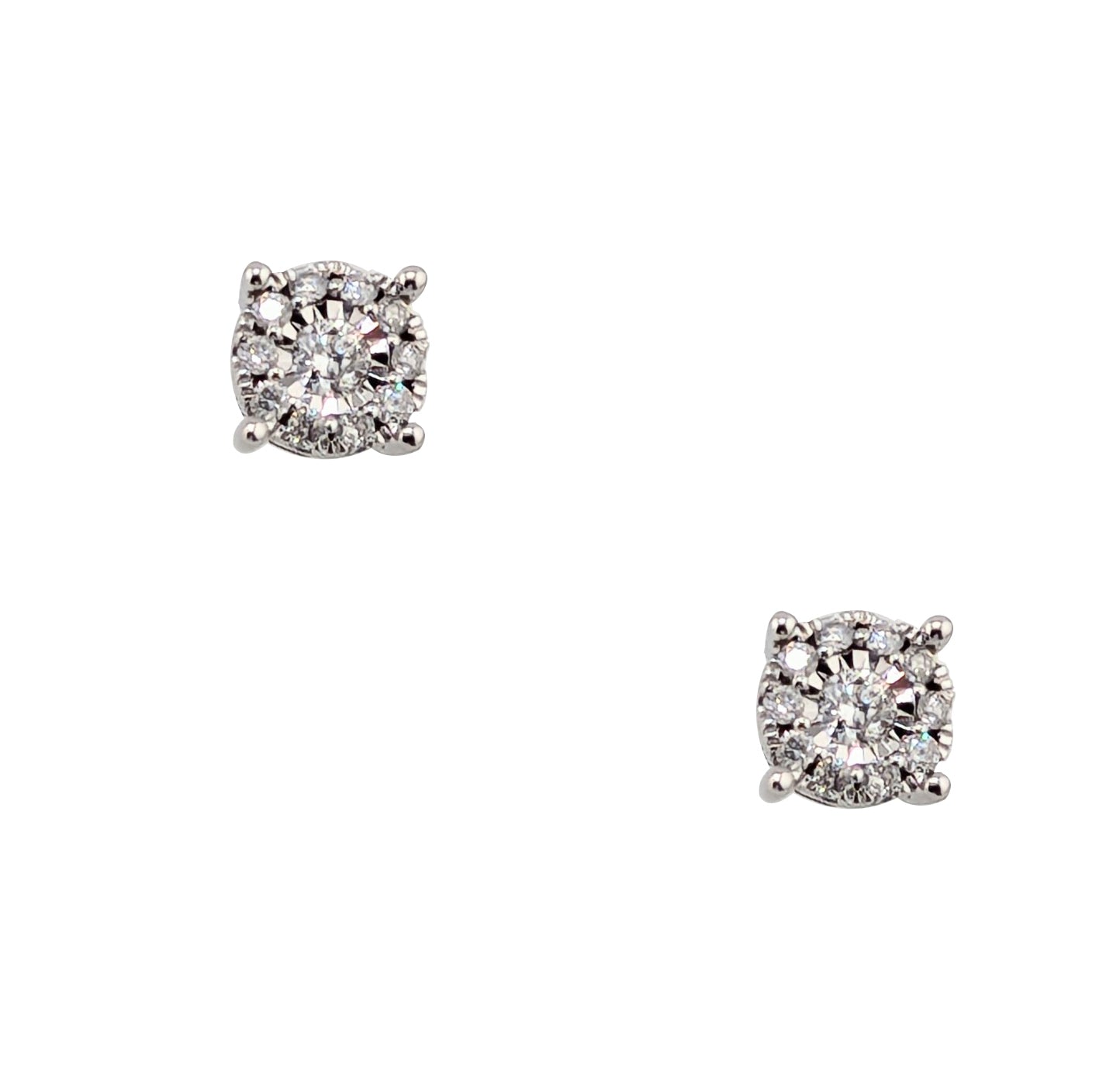 14kt white gold diamond cluster illusion setting earrings. These earrings feature 22 x 0.65 total carta weight of Brilliant cut diamonds of (I-1) in clarity and (J-K) in colour. Post and butterfly closure.