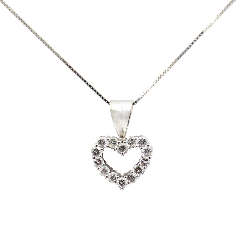 14kt white gold diamond pendant. This heart pendant features 0.40 total carta weight of Brilliant cut diamonds. Heart including bale measures: 16mm (L) x11mm (W). 14kt white gold box chain can be worn at 16" (L) or (18").