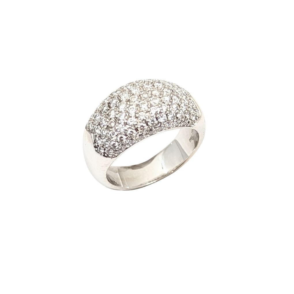 14kt white gold diamond pave set dome shape ring.This ring features 1.50ct total weight of Brilliant cut diamonds of (G-H ) in colour (VS-SI) in clarity.Measuring 12mm (W).
