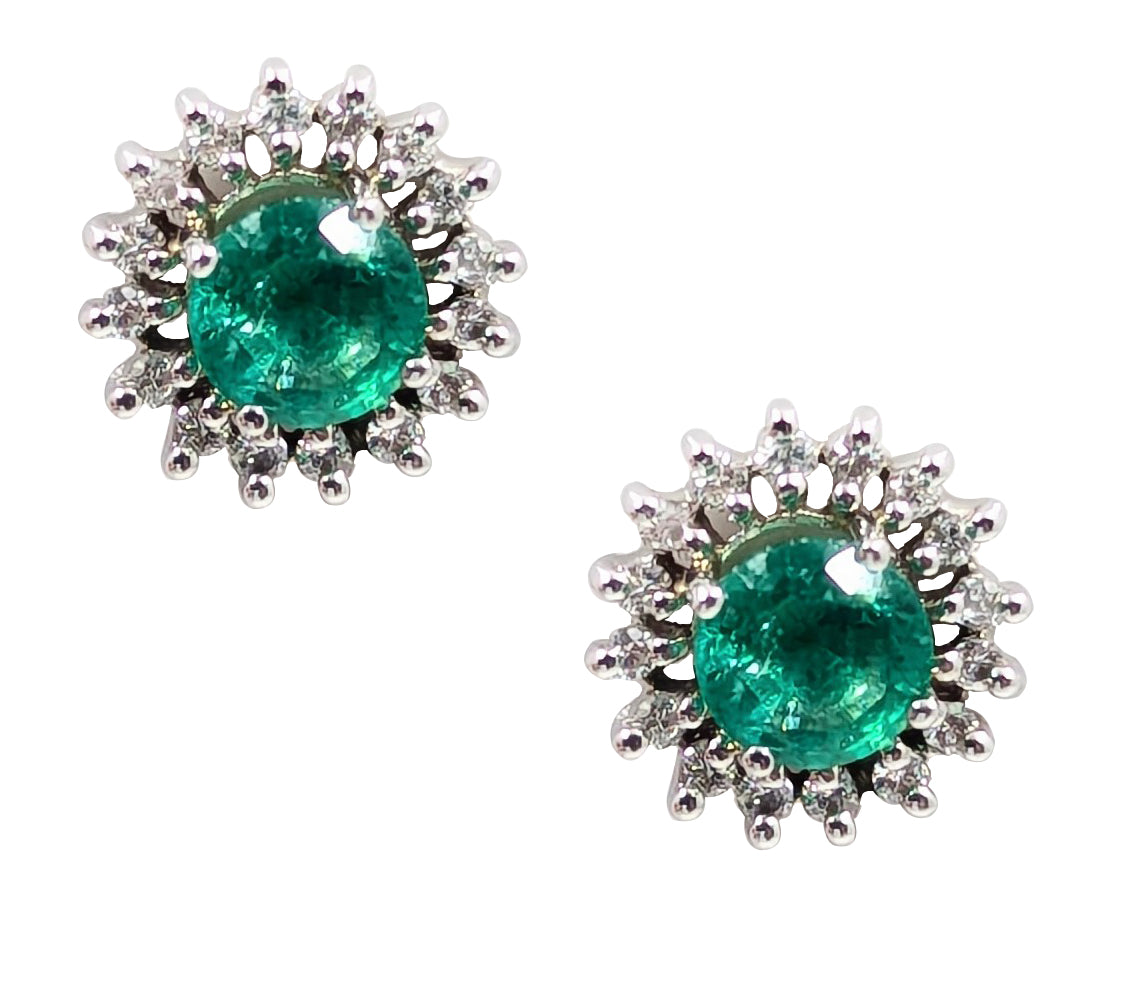 14kt white gold diamond cluster earrings set with one center round cut natural Emerald stone having a total carat weight of 1.00ct. The Emeralds have good colour saturation and hue. There are 32 x 0.32ct Tw round modern brilliant cut diamonds set around the Emeralds. They are secured to the ear with a threaded post and butterfly. The earrings are 10.5mm in diameter.