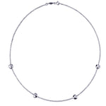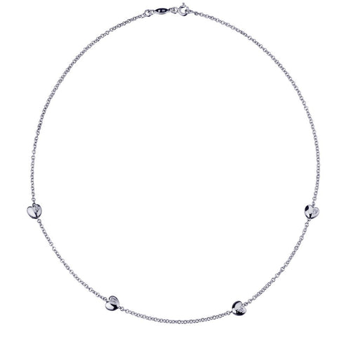 Ladies 14kt white gold necklace featuring (4) intermediate hearts each featuring round brilliant cut diamonds. 17" in length. 7.5 grams in weight.