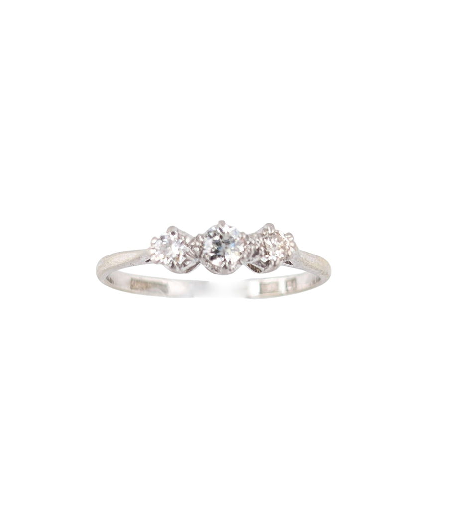 Ladies 18kt white gold diamond Trinity ring featuring 3 x 0.30ct  total carat weight of European cut diamonds of (S-I) in clarity and (G) in color. Current finger size is 7. This ring can be resized.