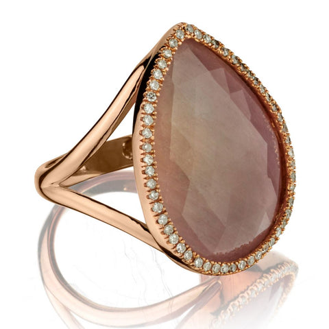 • 18kt rose gold ladies pear shape pink hue quartz ring