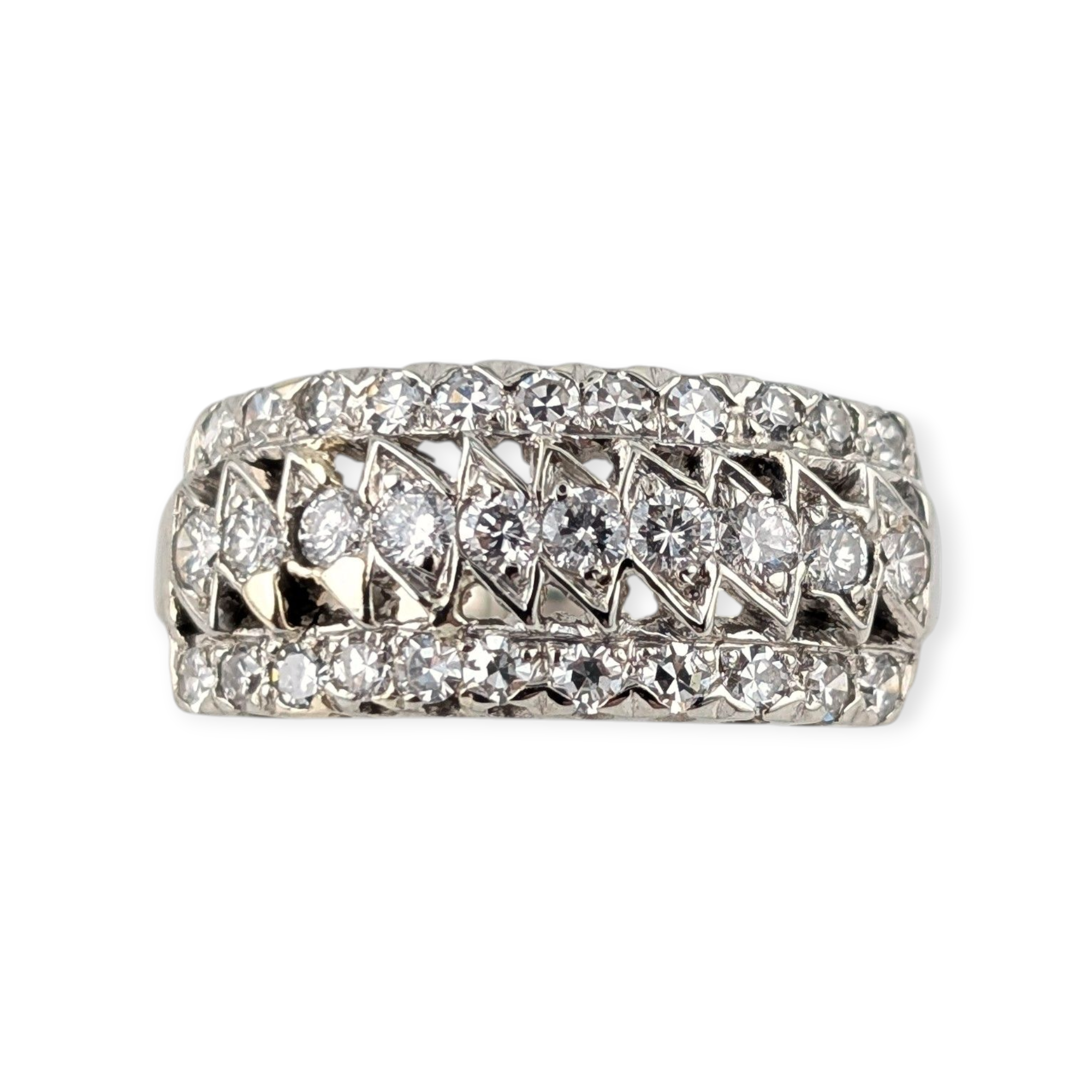 Ladies 18kt white gold diamond cluster ring featuring 9 x 0.60 carats of Brilliant cut round diamonds of SI clarity and F color. Current finger size is 4. This ring can be resized.