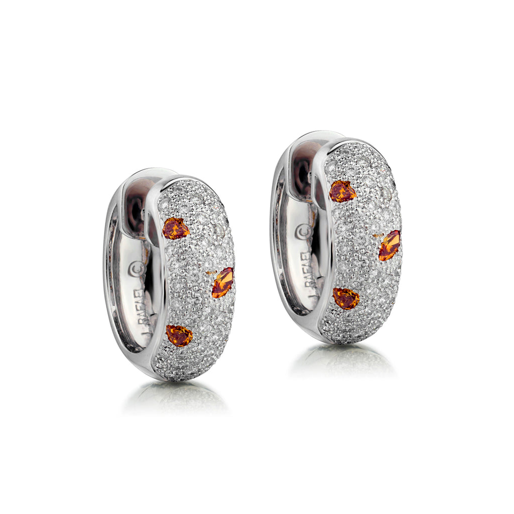 18kt white gold diamond hoop earrings. These earrings feature 2.00 total carat weight of brilliant cut diamonds  of (SI) in clarity and (G) in colour. Also featuring 6 fancy orange / cognac  diamonds. Pave setting. These earrings measure: 20mm (L) x 7.5mm (W). Weight: 18.18.